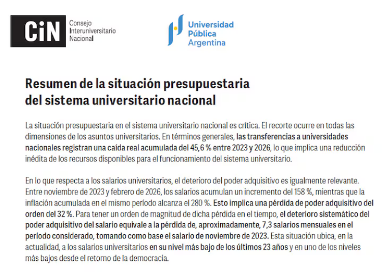Mientras tanto, las casas de estudio superiores públicas experimentan una disminución del 45.6% en términos reales de las transferencias estatales entre 2023 y 2026, según datos del Consejo Interuniversitario Nacional (CIN). Los recursos para gastos básicos como luz y mantenimiento equivalen actualmente solo al 40% de su valor en 2023.